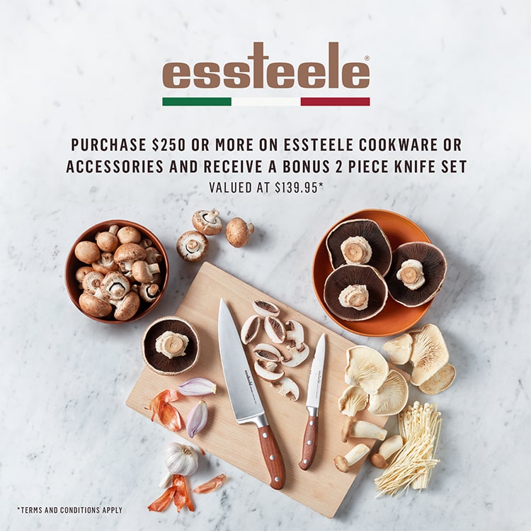 Spend over $250 on Essteele cookware or accessories between 1st August and 15th August and get the Essteele 2 piece knife pack valued at $139.95.