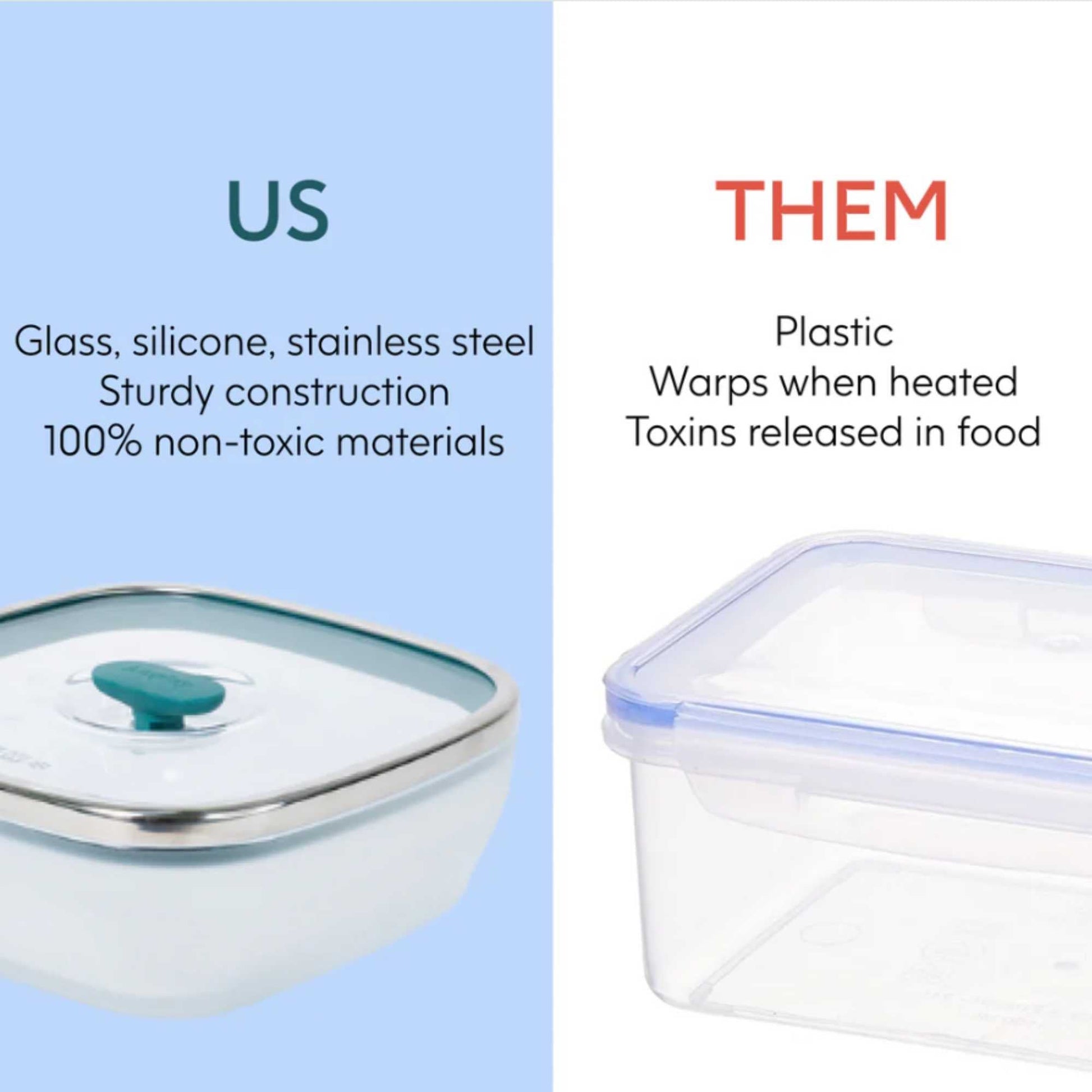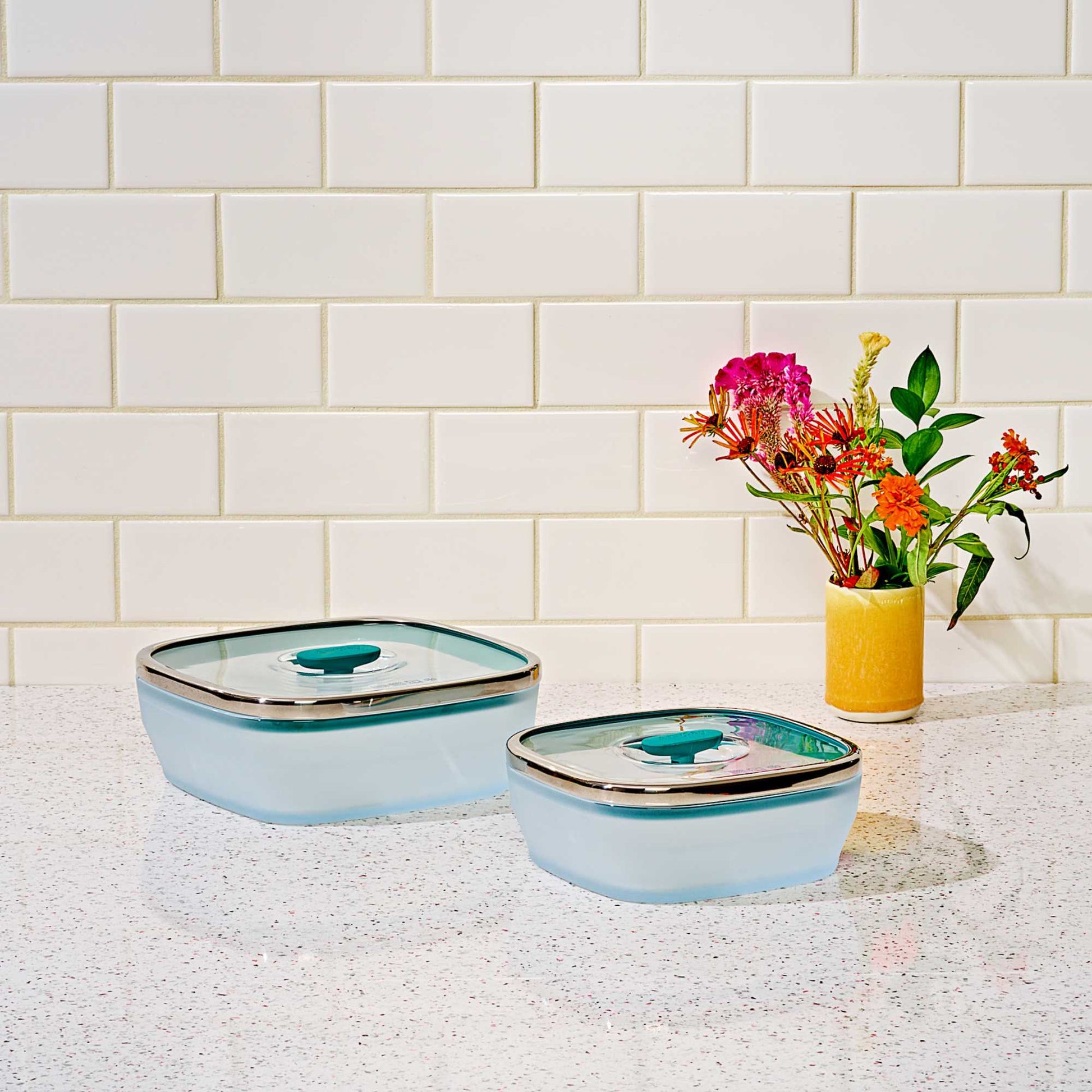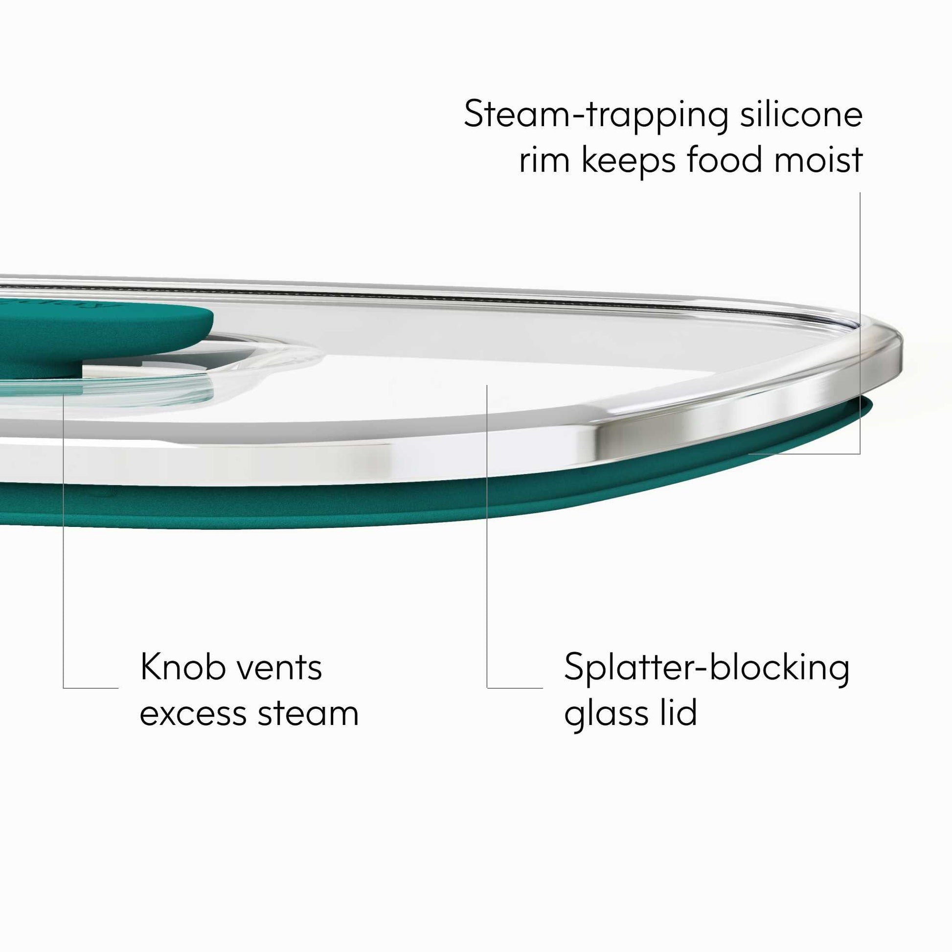 Our lids are made of glass with a vented knob that helps trap steam for faster, even cooking while also allowing excess steam to escape. This serves a dual purpose of keeping your food moist and preventing spills and messes. When not using for cooking and reheating, simply press the vented knob down for airtight food storage.
