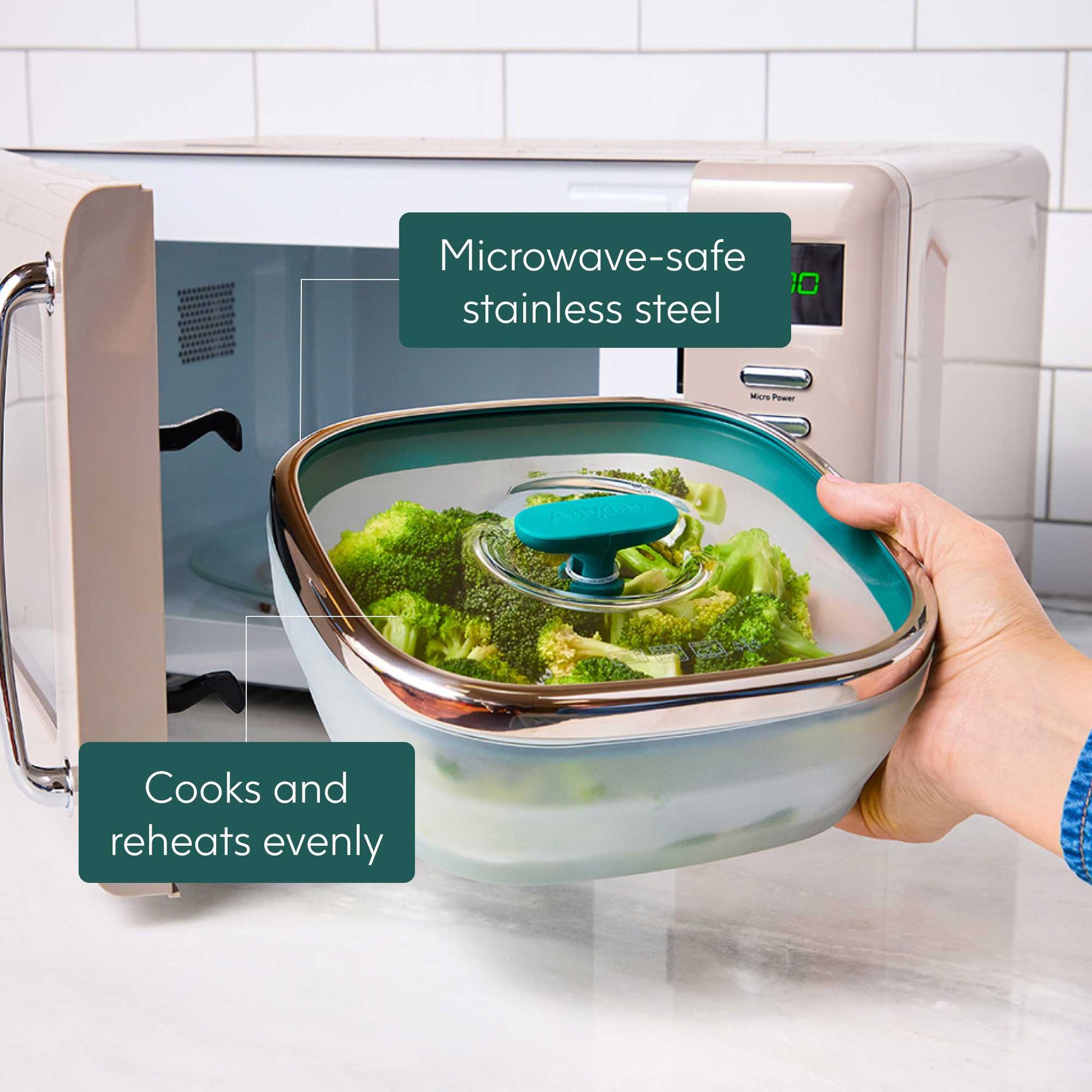 - Steam: Cook veggies, grains & proteins (from scratch) in the microwave at the push of a button