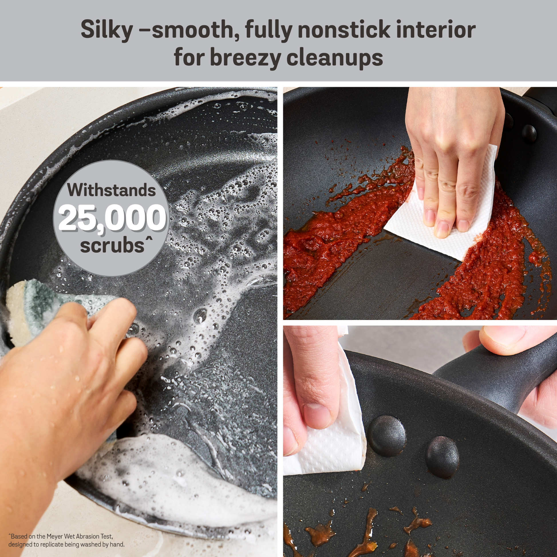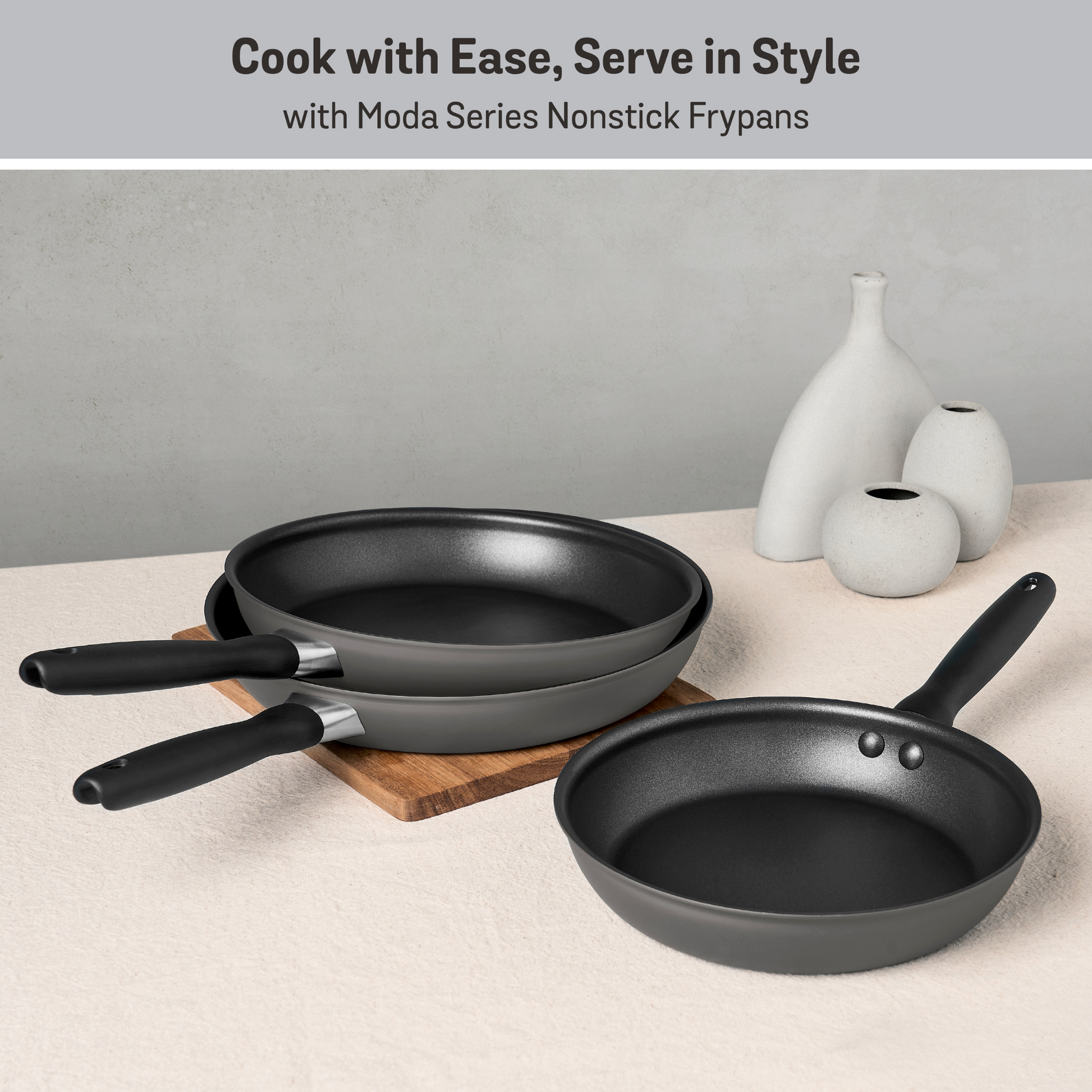 The Meyer Moda Series 24cm Nonstick Frypan delivers effortless cooking and sleek style, with a ceramic-reinforced nonstick surface that lasts 8x longer* and withstands 25,000 scrubs^.