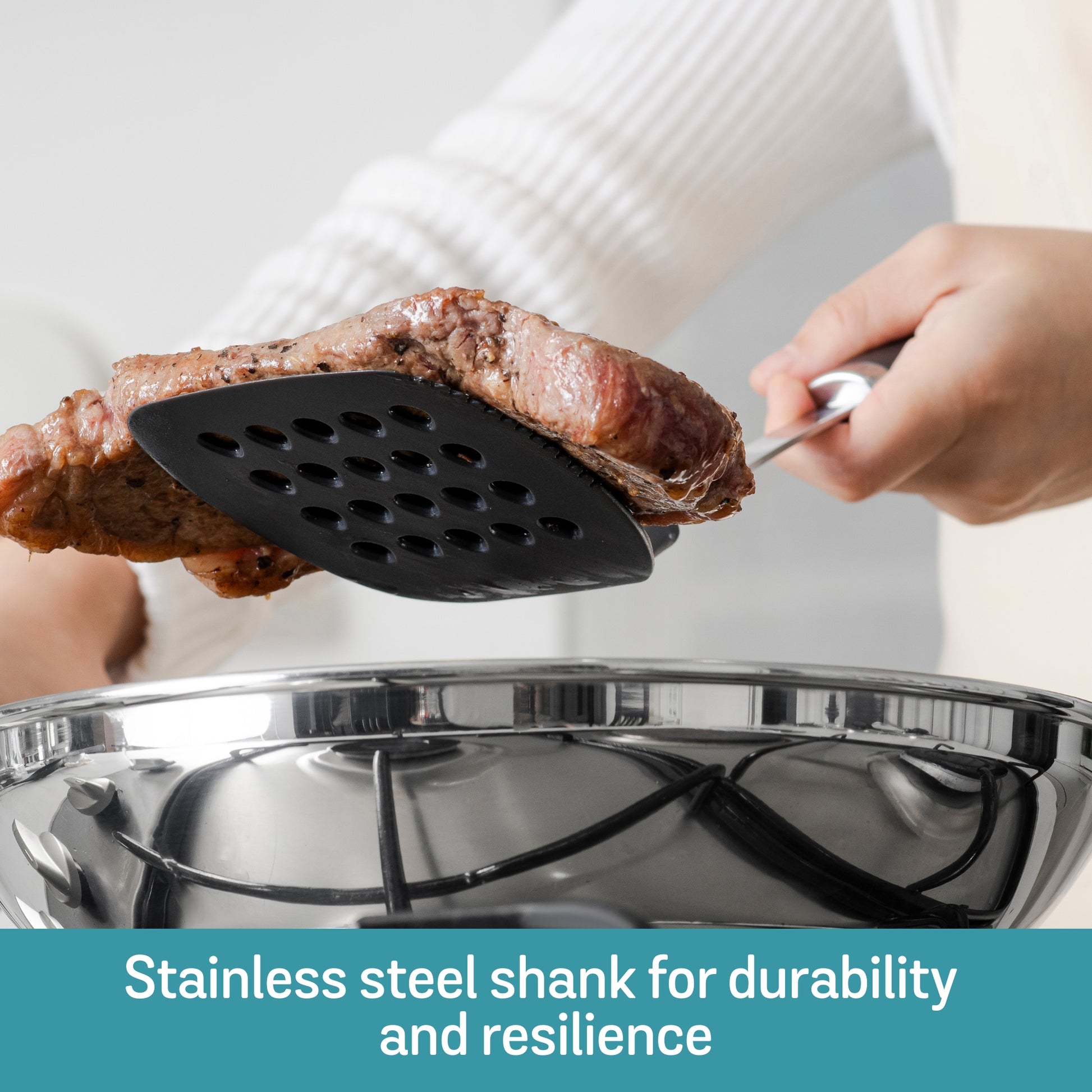 Whether you're draining excess oil or cutting through soft foods, this versatile utensil delivers precision and comfort in every use.